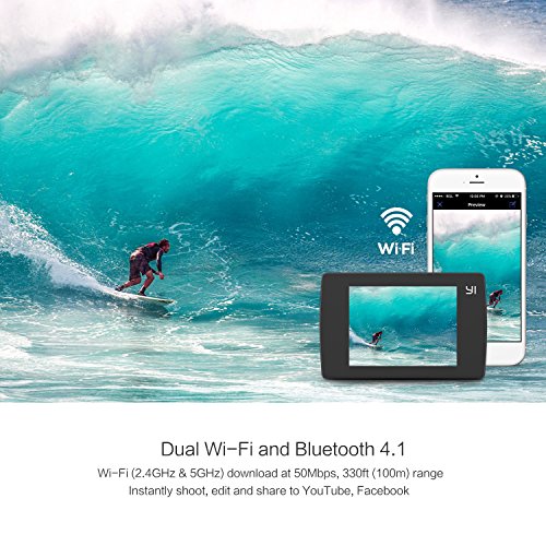- Bluetooth y Wi-Fi de doble banda - transfiere rápidamente sus archivos de la cámara al teléfono inteligente con el mejor wifi de doble banda de 5Ghz a una velocidad de 50 Mbps. La cámara está completamente bajo el control del teléfono a través de la aplicación YI Action Camera hasta 100 metros de distancia. Grabación hasta a 10 metros de su YI Lite cuando se conecta al control remoto Bluetooth. Transmita de forma instantánea momentos apreciados a sus amigos y plataforma social