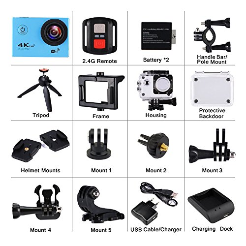 Título: Cámara Acción Deportiva Ultra HD 4K 16MP WiFi Impermeable DV Videocámara Acuática 2.0" LCD 170° Gran Angular 2 Pulgadas LCD Screen / 2.4G control Remoto / 2 Baterías Recargables (Azul)